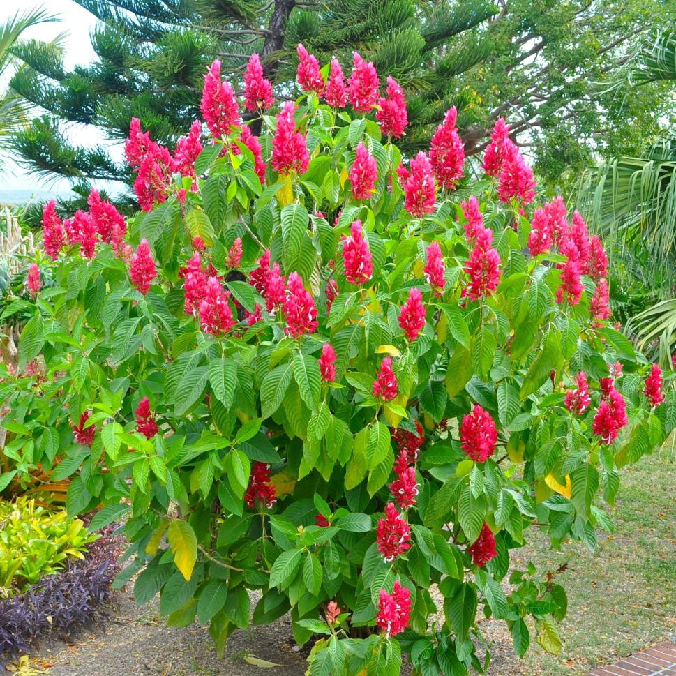 A brilliant tropical to sub tropical flowering shrub, Megaskepasma erythrochlamys is also known as Red Justica and Brazilian Red Cloak. Reaching around 2m (taller in ideal conditions) this is a winter flowering plant that has masses of red flowers held above a mid green glossy foliage.
